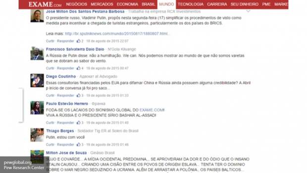 «Наиболее существенно рейтинг России снизился в Бразилии…» — заявляют в вашингтонской конторе: 61% – неодобрение, 26% – одобрение.